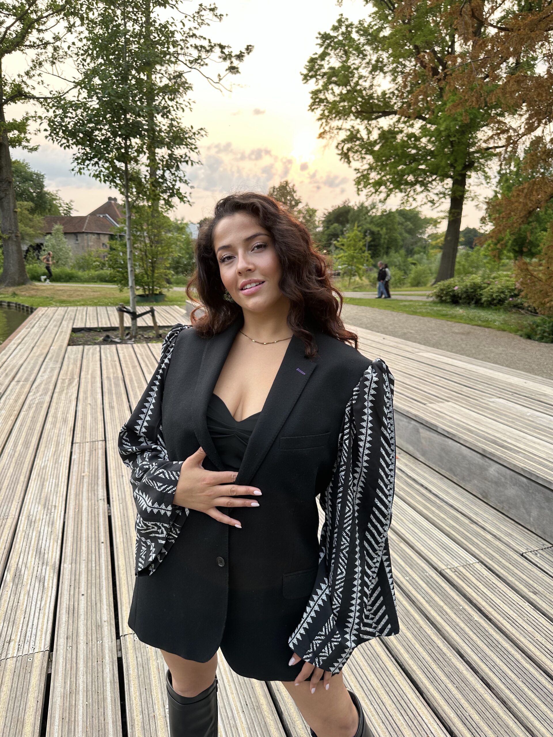 De mouwen zijn voorzien van een wit motiefje dat voor net dat beetje extra zorgt – verfijnd, stijlvol en net even anders. Een perfecte blazer voor wie houdt van met een uniek accent.