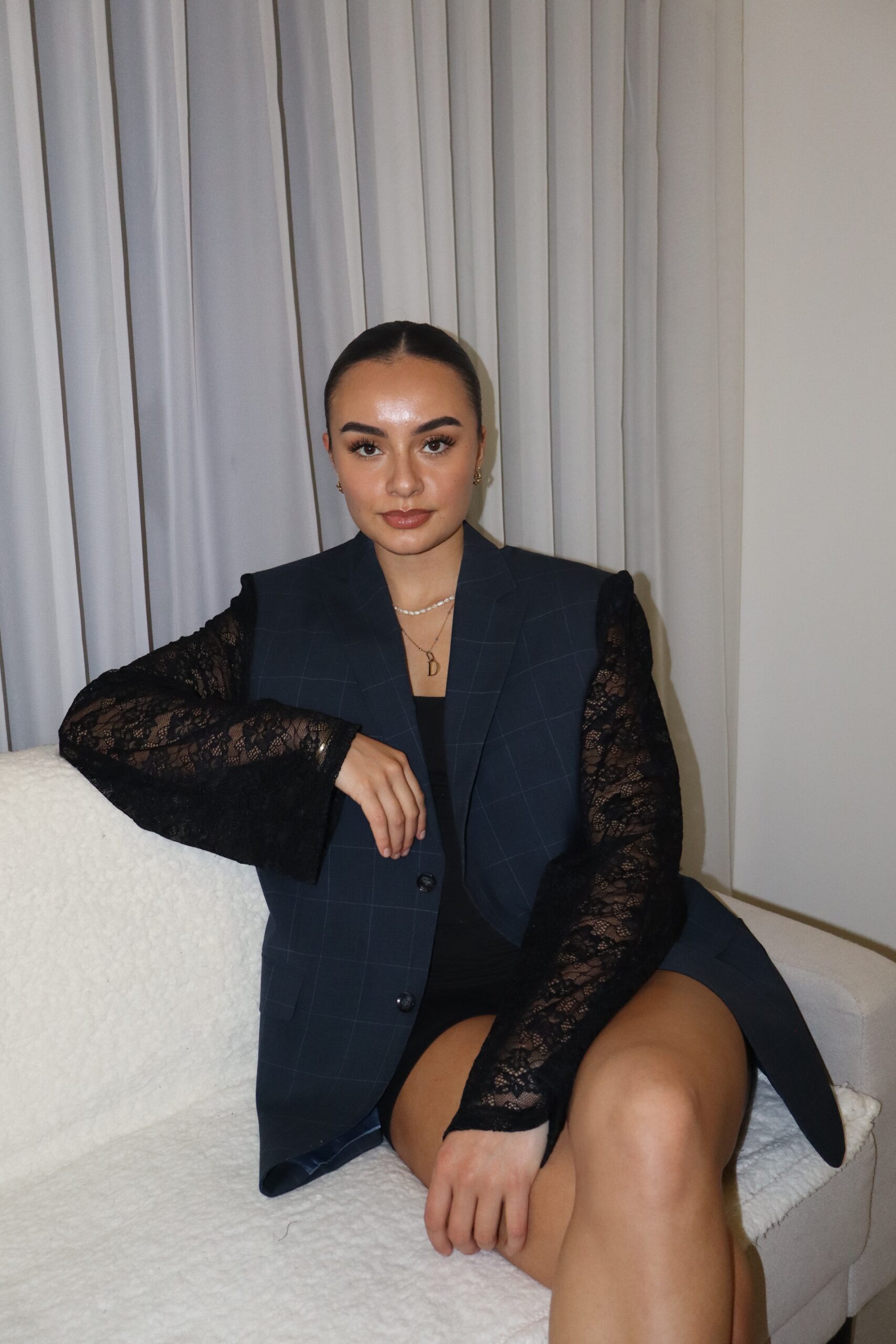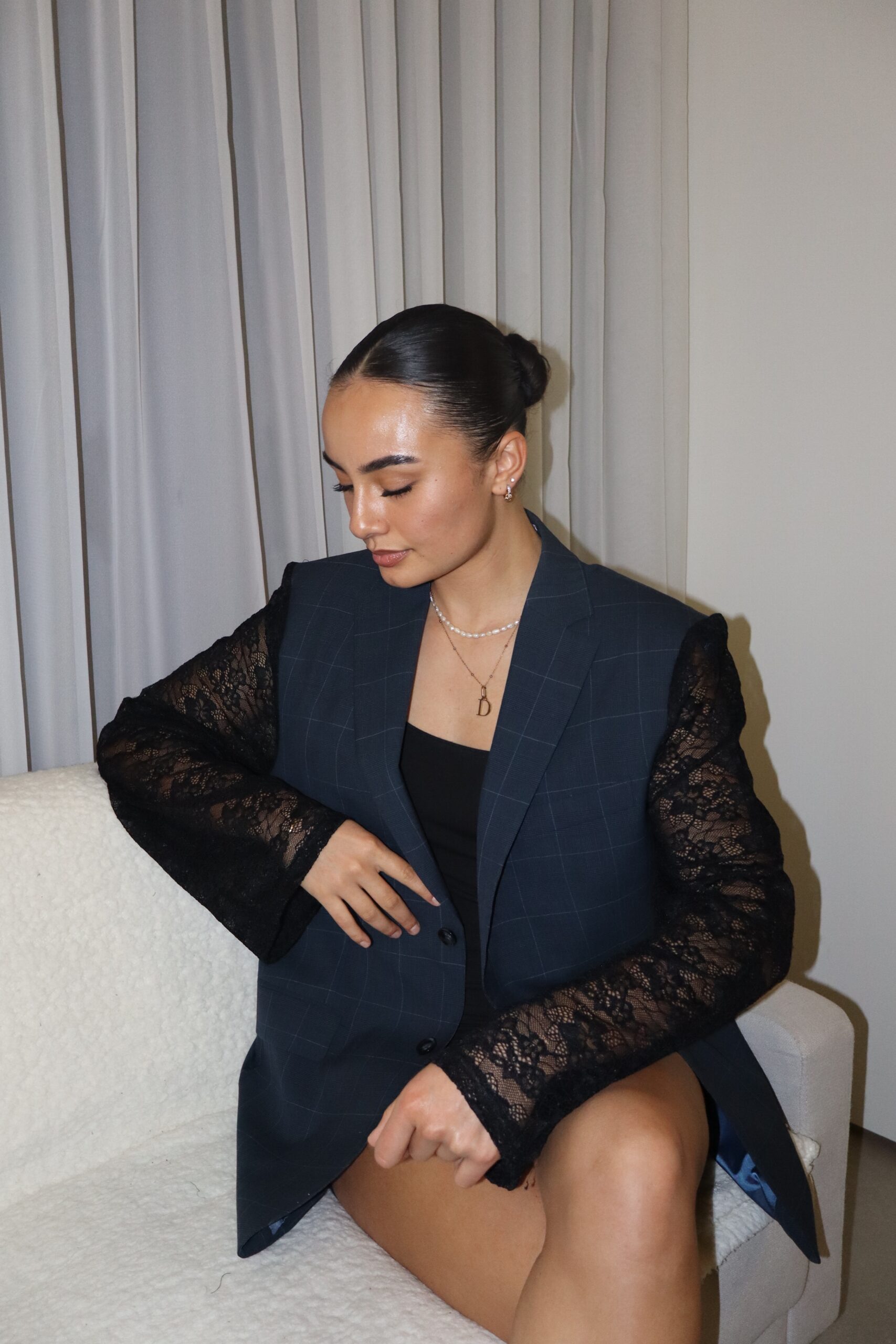 De klassieke snit krijgt een moderne twist door de zwarte kanten mouwen, die subtiel een vrouwelijke charme toevoegen. Deze blazer is perfect voor zowel een zakelijke vergadering als een avondje uit, en geeft je look net dat beetje extra flair.