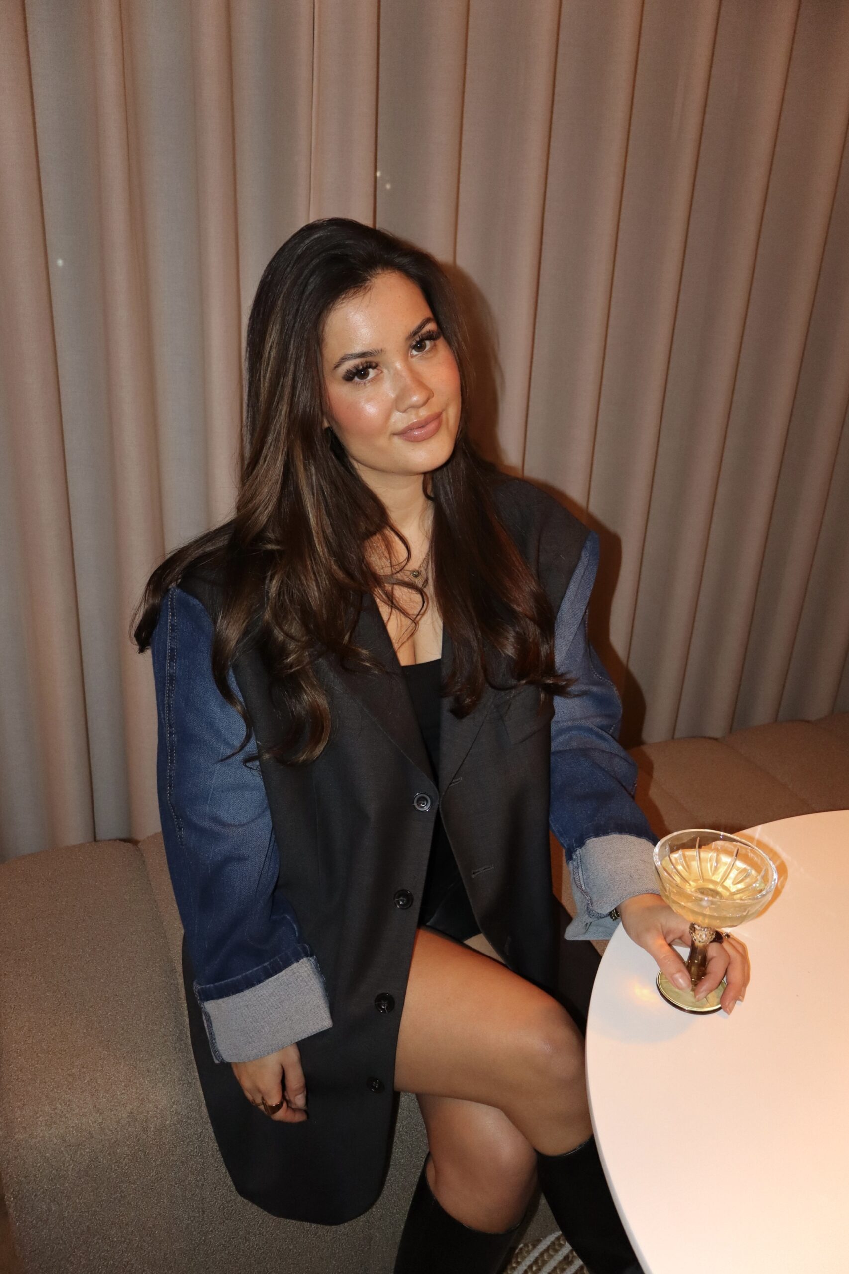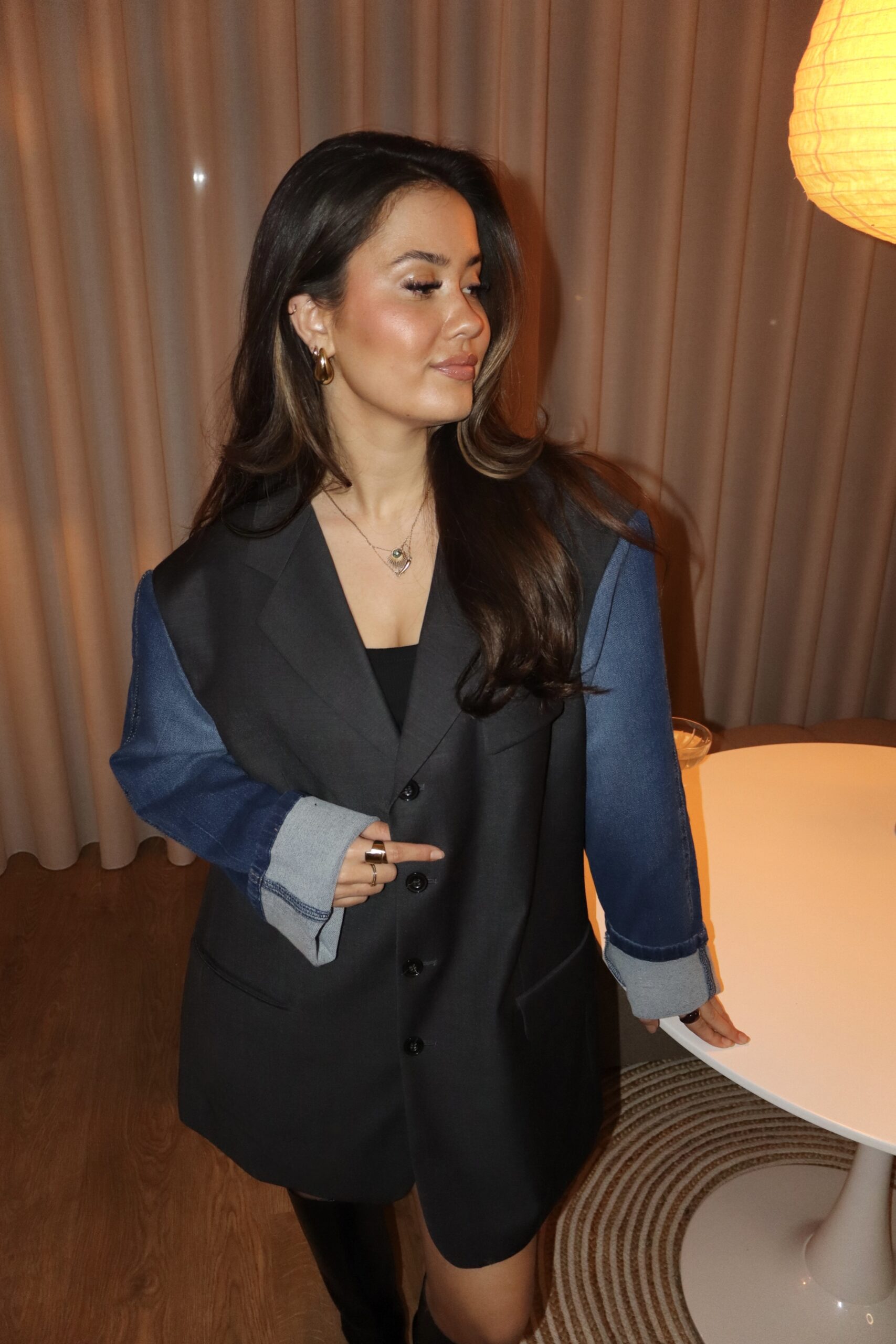 Deze donkergrijze blazer krijgt een moderne upgrade met donkerblauwe denim mouwen, die zorgen voor een gedurfde, maar stijlvolle uitstraling. De klassieke grijze kleur geeft een chique en tijdloze look, terwijl de denim mouwen voor een casual touch zorgen. Ideaal voor zowel een zakelijke look als een informele, modieuze outfit.