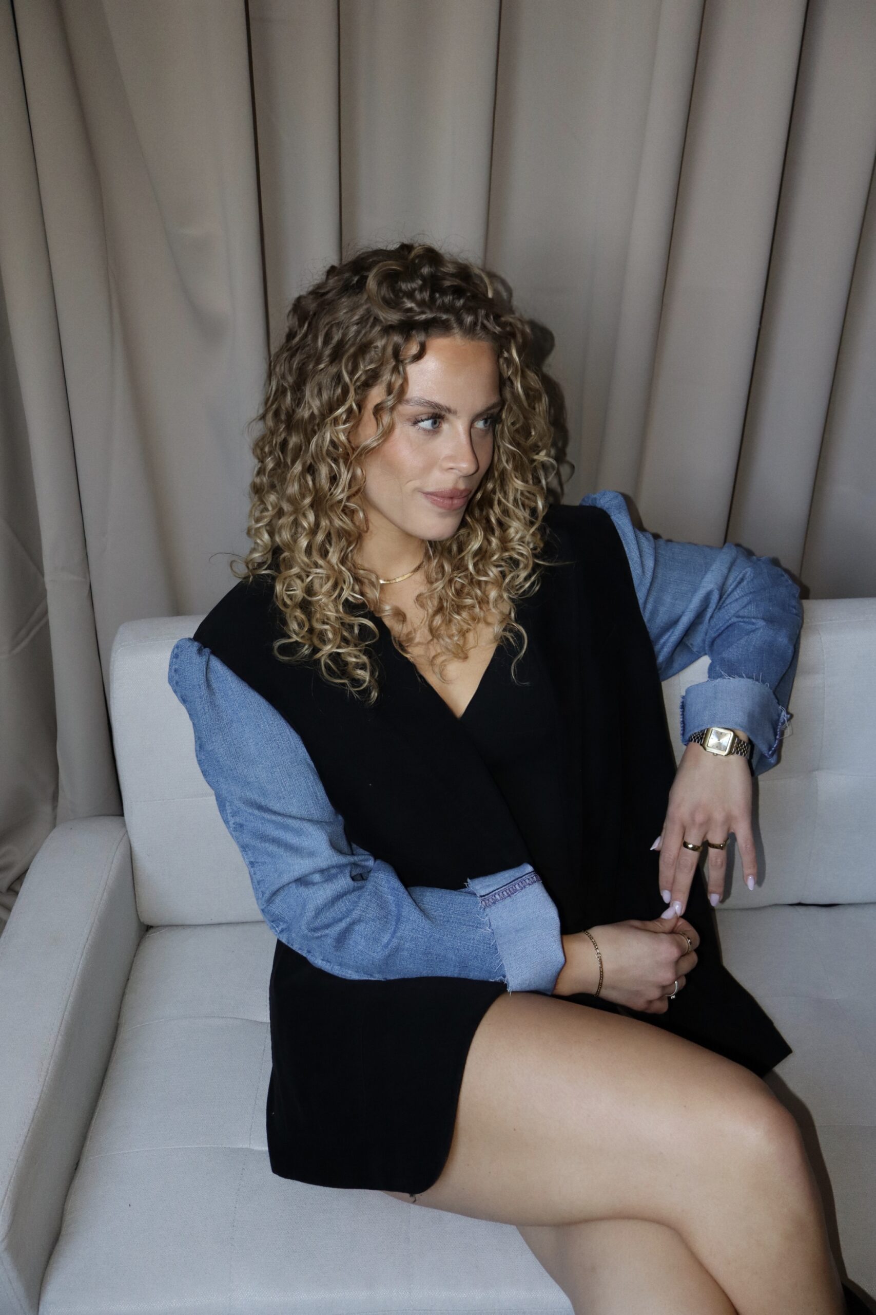 Deze zwarte blazer krijgt een frisse, eigentijdse uitstraling door de toevoeging van lichte denim mouwen. De contrastcombinatie van klassiek zwart en licht denim zorgt voor een opvallende look die zowel stoer als stijlvol is.