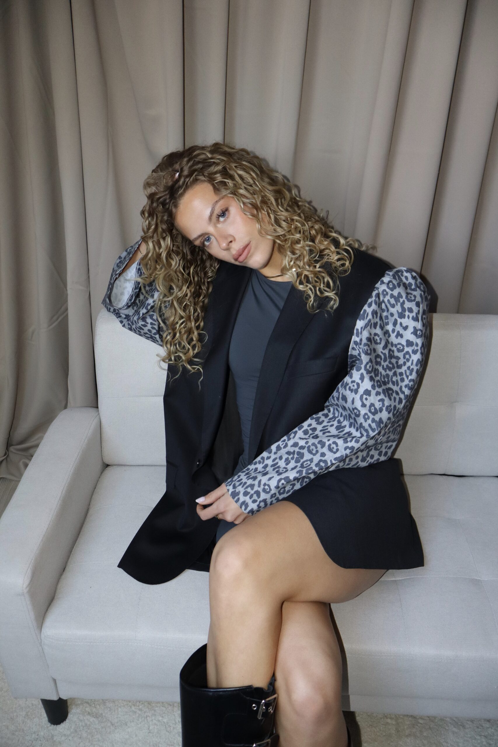 Deze donkergrijze blazer met pantermouwen is de perfecte balans tussen chique en edgy. De subtiele grijze kleur van de blazer wordt gecombineerd met de opvallende panterprint op de mouwen, waardoor deze blazer een statement maakt zonder te schreeuwen.