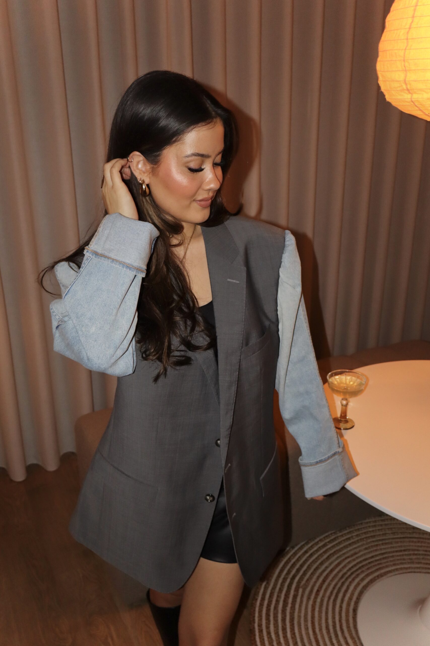 Deze grijze blazer krijgt een moderne upgrade met lichte denim mouwen, wat zorgt voor een frisse en stijlvolle look. De grijze kleur biedt een verfijnde uitstraling, terwijl de lichte denim mouwen een speelse twist geven. Perfect voor zowel een professionele werkoutfit als een casual weekendlook.