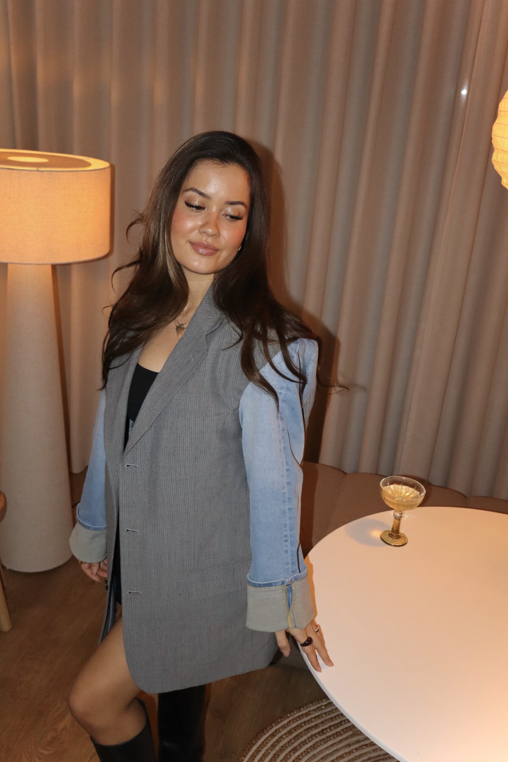 Draag hem met een nette broek voor een elegante uitstraling of combineer met een jeans voor een trendy, laid-back vibe. De combinatie van het streepje en de denim mouwen maakt deze blazer veelzijdig en uniek.