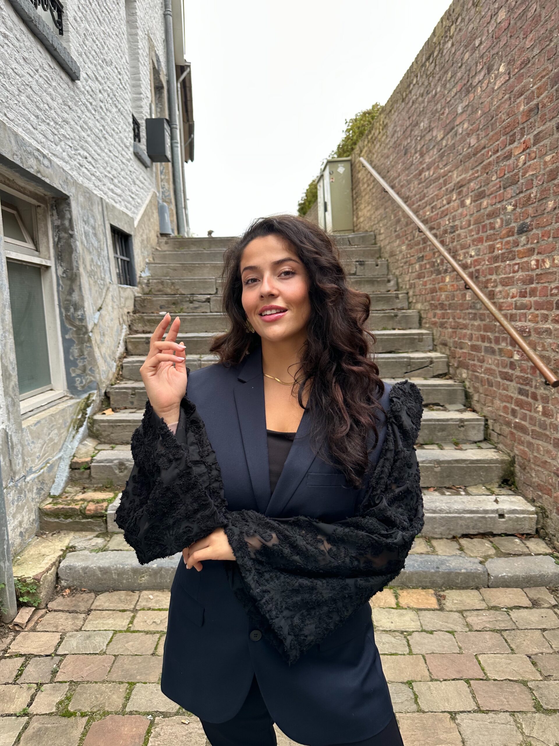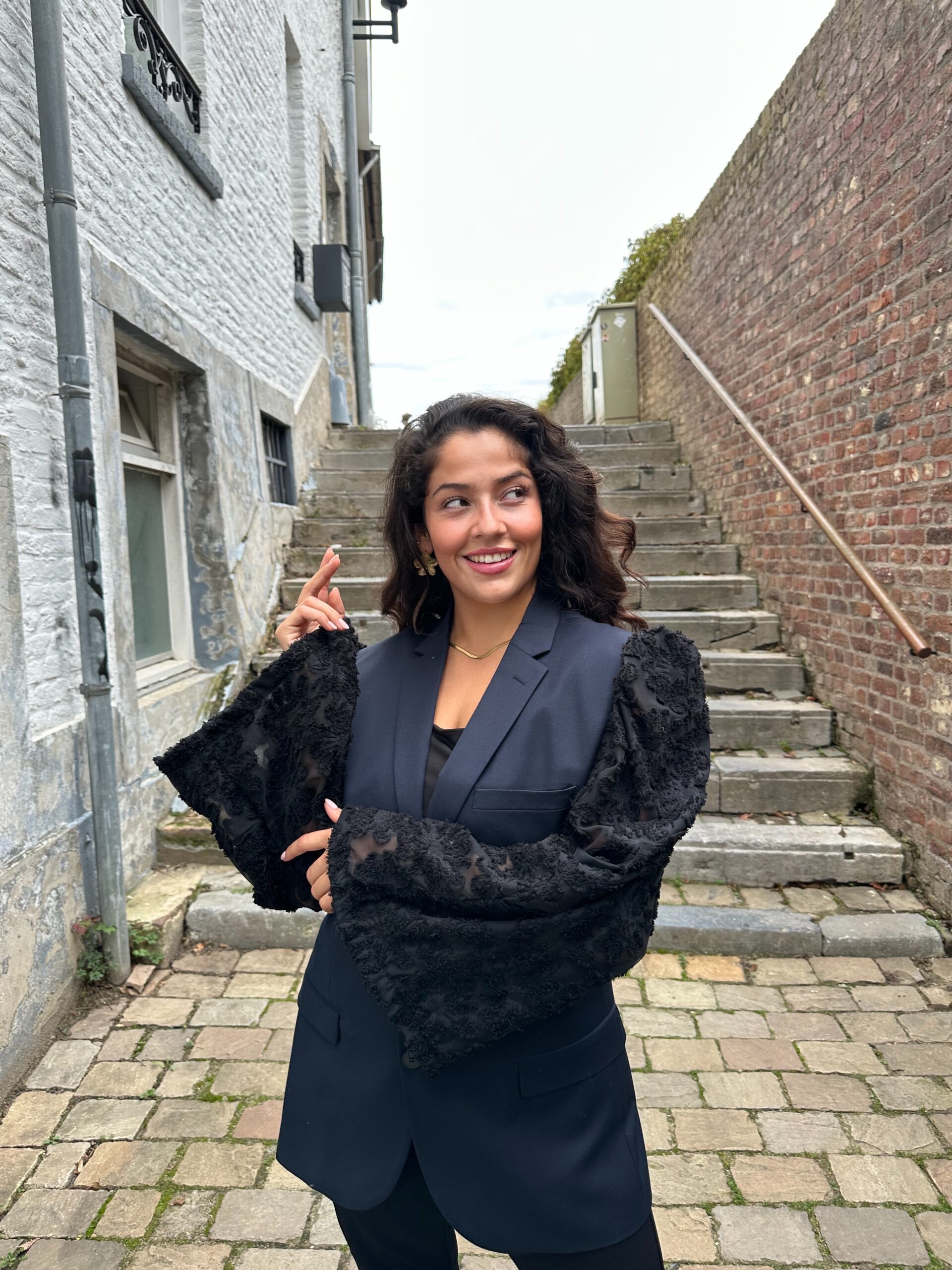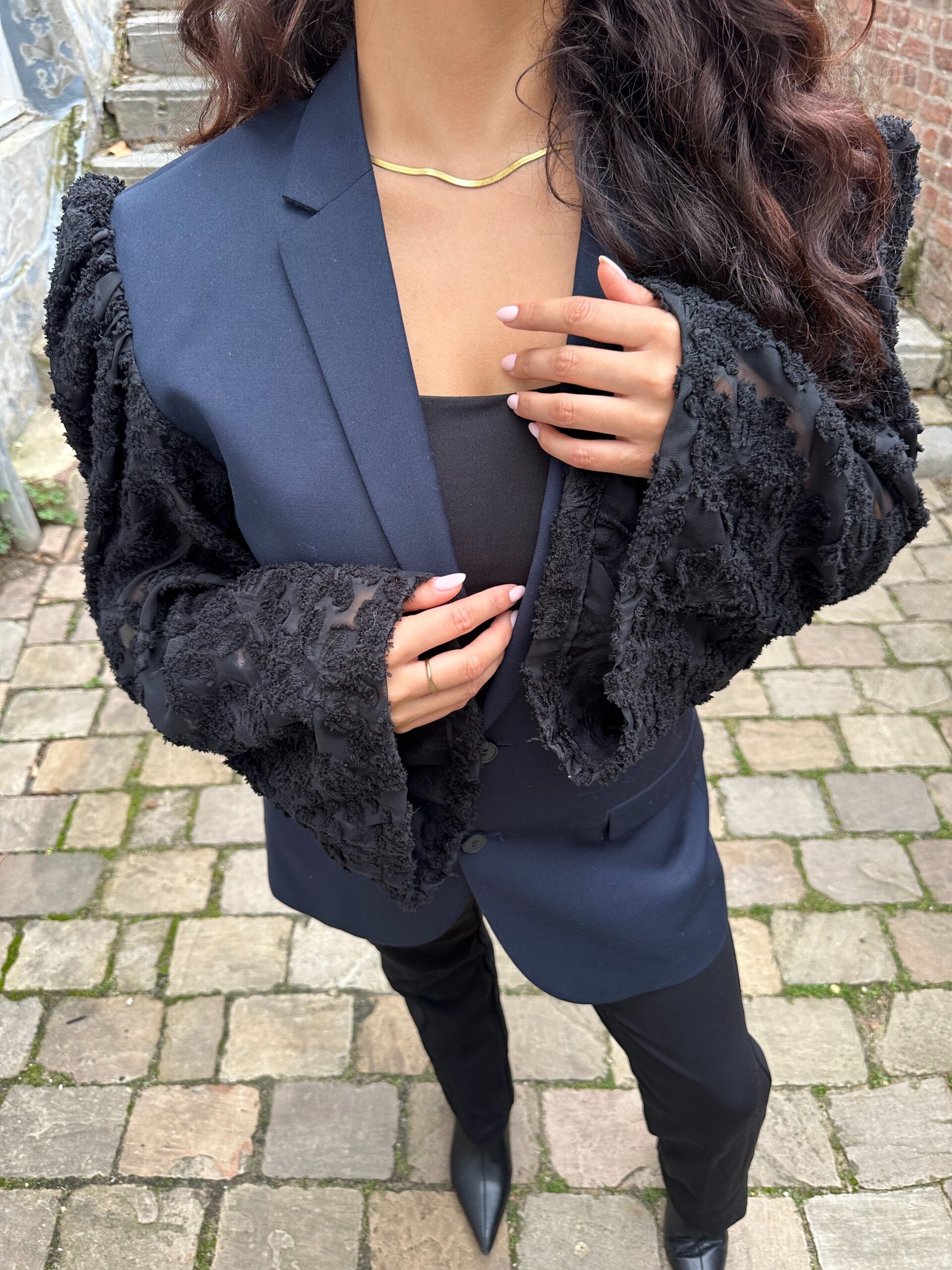 De zwarte mouwen zijn gedecoreerd met subtiele bloemen, waardoor de blazer een verfijnde, vrouwelijke uitstraling krijgt zonder te opvallend te zijn.